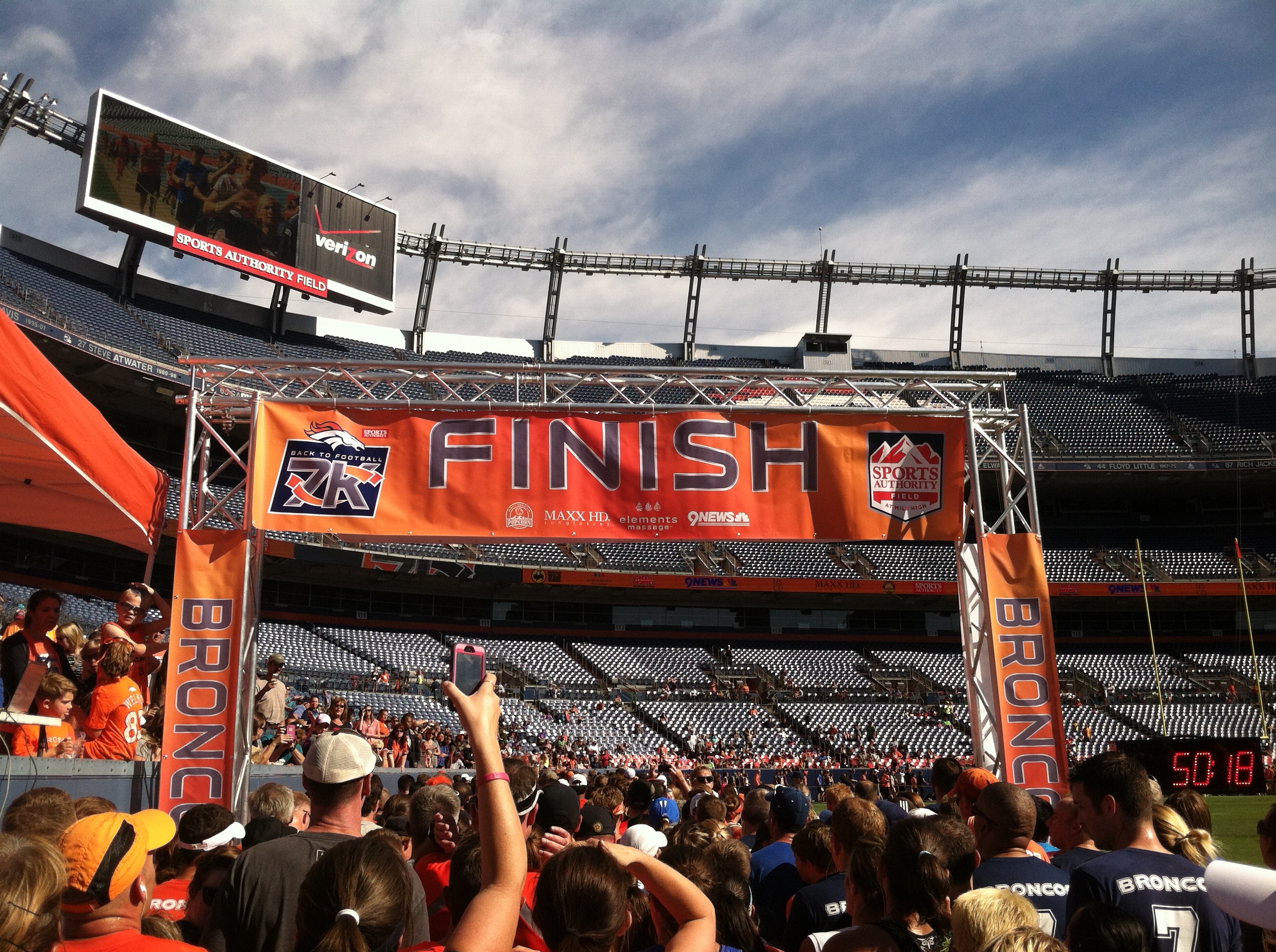 The backup starts in the chute. Then, you realize that by “run onto Mile High field!” the organizers actually meant, “run on the sidelines that are cordoned off and guarded!” You guessed it…the players’ chute bottleneck goes into an even more intense bottleneck at the narrow lane at the finish line.