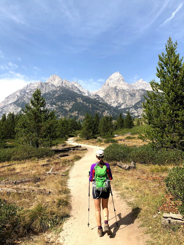 woman hiking away from the camera with trekking poles in grand teton national park